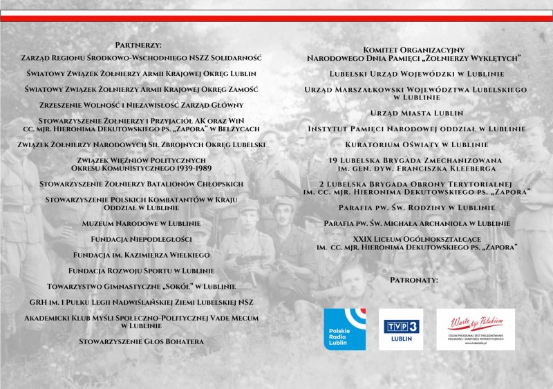 W imieniu organizatorów zapraszamy na obchody Narodowego Dnia Pamięci Żołnierzy Wyklętych. Czcijmy i dbajmy o pamięć Żołnierzy Wyklętych, niech Ich niezłomna postawa będzie dla młodych Polaków wzorem patriotyzmu oraz takich wartości jak: wolność, honor, solidarność i poświęcenie. Wspólnie oddajmy hołd Żołnierzom Niezłomnym.