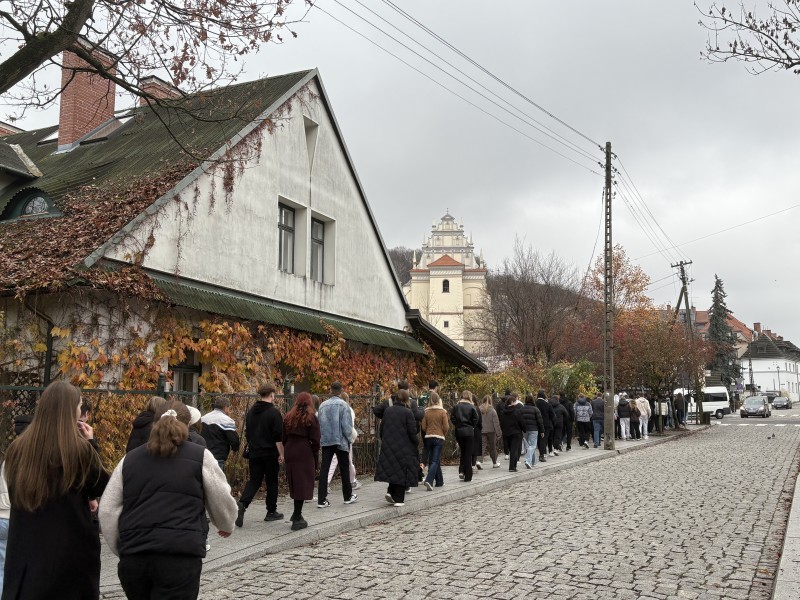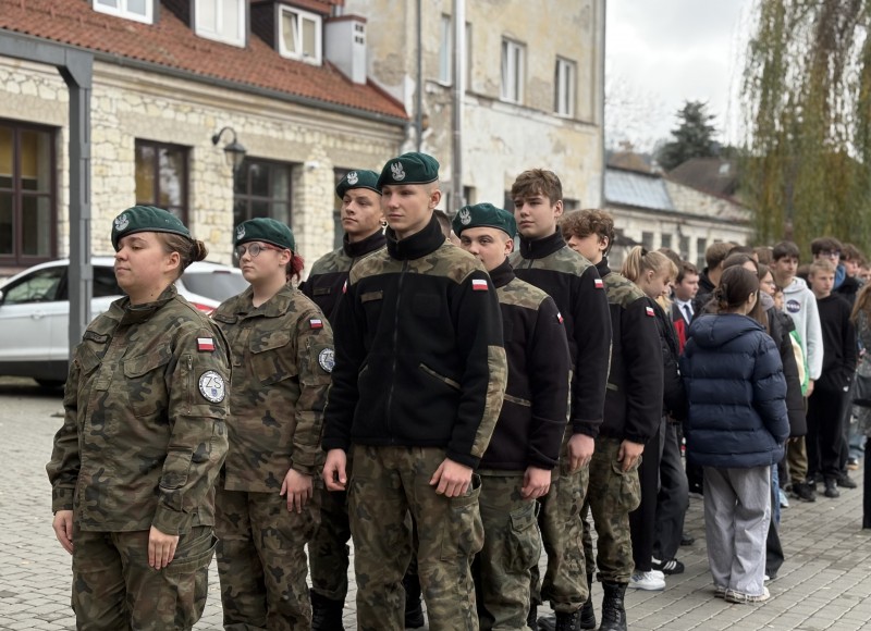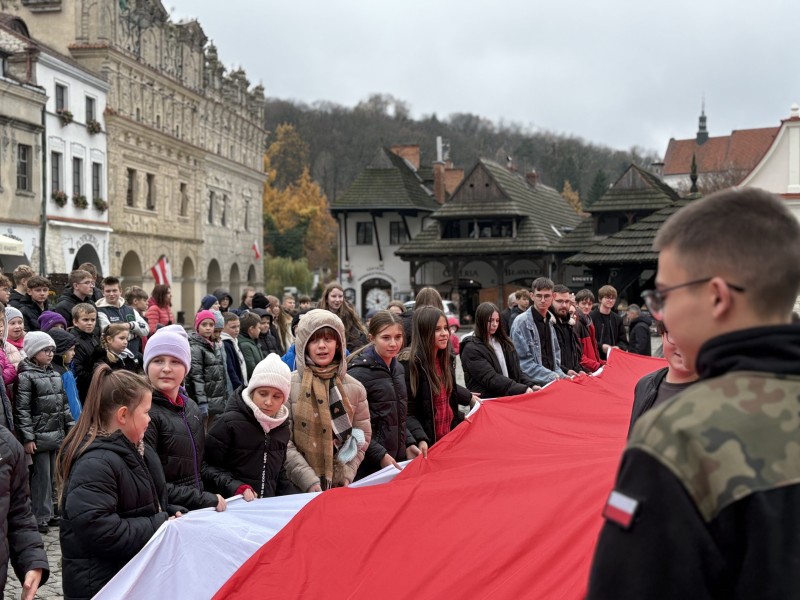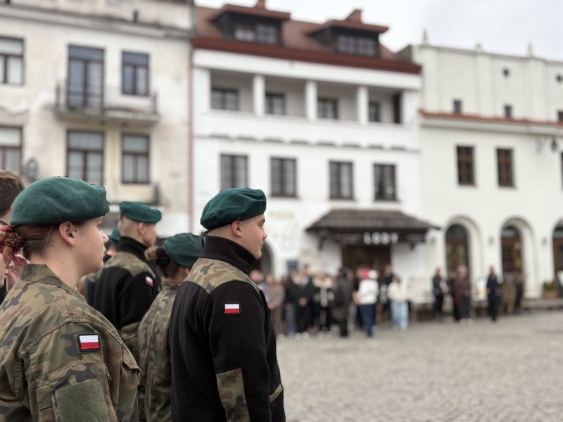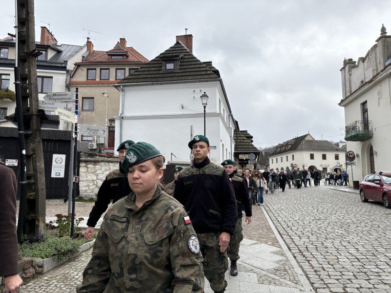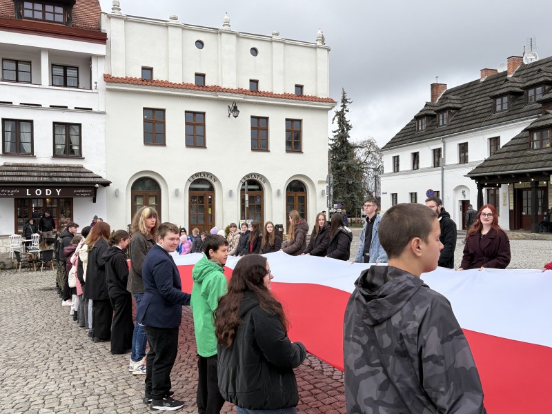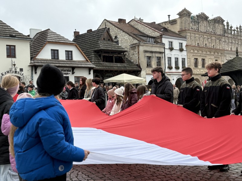 Podczas wspólnego odśpiewania hymnu państwowego na rynku wobec flagi narodowej obecni byli: dyrektor Kazimierskiego Ośrodeka Kultury Promocji i Turystyki, dyrektorzy szkół oraz Artur Pomianowski - Burmistrz Kazimierza Dolnego.