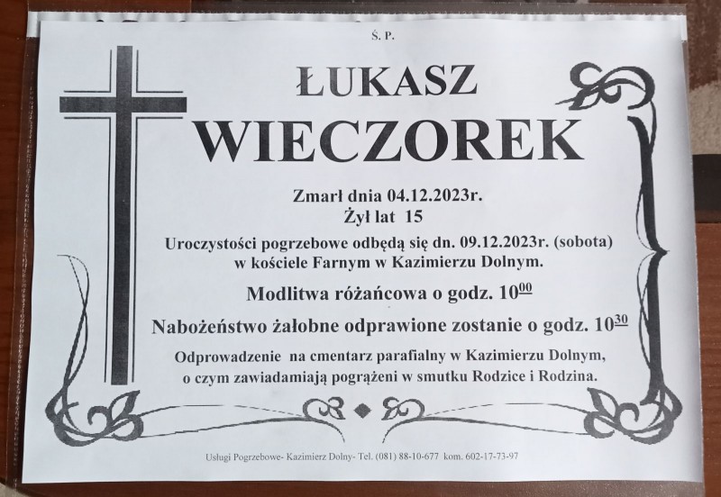 Z głębokim smutkiem zawiadamiamy, że uroczystości pożegnalne Ucznia naszej szkoły Łukasza Wieczorka z klasy 2az odbędą się w sobotę 9 grudnia o godzinie 10:30 w kościele farnym w Kazimierzu Dolnym.