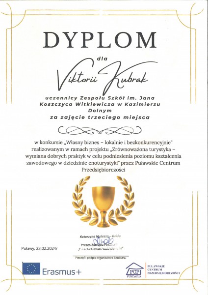 Z przyjemnością informujemy, ze uczennica naszej szkoły Viktoriia Kubrak z klasy 3at zajęła III miejsce w konkursie „Własny biznes-lokalnie i bezkonkurencyjnie” realizowanego przez Puławskie Centrum Przedsiębiorczości w ramach projektu „ Zrównoważona turystyka-wymiana dobrych praktyk w celu podniesienia poziomu kształcenia zawodowego w dziedzinie enoturystyki”.