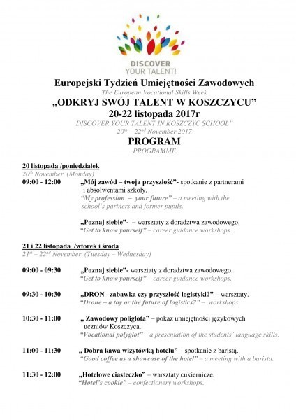 W dniach 5 - 9 grudnia 2016r. w naszej szkole odbył się I Europejski Tydzień Umiejętności Zawodowych pod hasłem „Odkryj swój talent w Koszczycu”. Poprzez to wydarzenie chcieliśmy zaprezentować naszą ofertę kształcenia oraz przyczynić się do wzrostu świadomości młodych ludzi nt. szkolnictwa zawodowego.